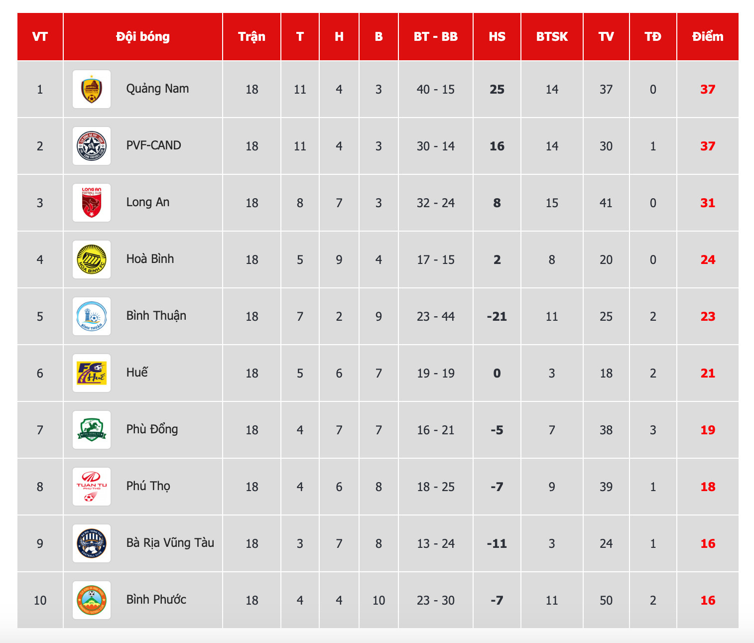 Nhờ hơn PVF-CAND chỉ số phụ trước lượt trận cuối giải hạng Nhất 2023, Quảng Nam nắm quyền tự quyết trong cuộc đua vô địch và giành tấm vé duy nhất lên chơi V-League.Sân Tam Kỳ gần như không còn chỗ trống trong ngày Quảng Nam thi đấu trận cuối ở mùa giải 2023.Người hâm mộ Quảng Nam chờ khoảnh khắc đội bóng quê hương trở lại V-League sau 3 năm thi đấu ở giải hạng Nhất.Không chỉ được chơi trên sân nhà, Quảng Nam chỉ phải tiếp đối thủ "mềm" Bà Rịa Vũng Tàu - đội vừa thoát hiểm ở vòng trước để trụ hạng thành công.Hơn đối thủ về mọi mặt, Quảng Nam sớm áp đặt được thế trận.Chỉ trong 10 phút đầu, Quảng Nam có hai bàn thắng do công của Văn Toàn và Đình Bắc.Đội chủ nhà có được những bàn thắng dễ dàng khi chơi lấn lướt hoàn toàn đối thủ.Niềm vui của các cầu thủ Quảng Nam khi liên tục "xé lưới" Bà Rịa Vũng Tàu.Văn Nam ấn định chiến thắng 4-0 cho đội chủ nhà ở phút 85. Với kết quả này, Quảng Nam vô địch giải hạng Nhất với 37 điểm. Đội đứng thứ 2 là PVF-CAND, đứng thứ ba là Long An. Đội xếp chót bảng là Bình Phước (16 điểm).Dù gặp rất nhiều khó khăn và có thời điểm tưởng như phải bỏ không tham dự giải vì thiếu kinh phí, nhưng HLV Văn Sỹ Sơn và các học trò đã vượt qua để có cái kết có hậu.Người hâm mộ Quảng Nam ăn mừng khi đội nhà trở lại sân chơi V-League sau 3 năm chờ đợi. Thầy trò HLV Văn Sỹ Sơn chỉ có chưa tới 2 tháng chuẩn bị lực lượng cho mùa giải 2023/2024, dự kiến khởi tranh vào từ ngày 20/10. Khoảnh khắc mừng chiến thắng của Quảng NamBXH chung cuộc giải hạng Nhất 2023