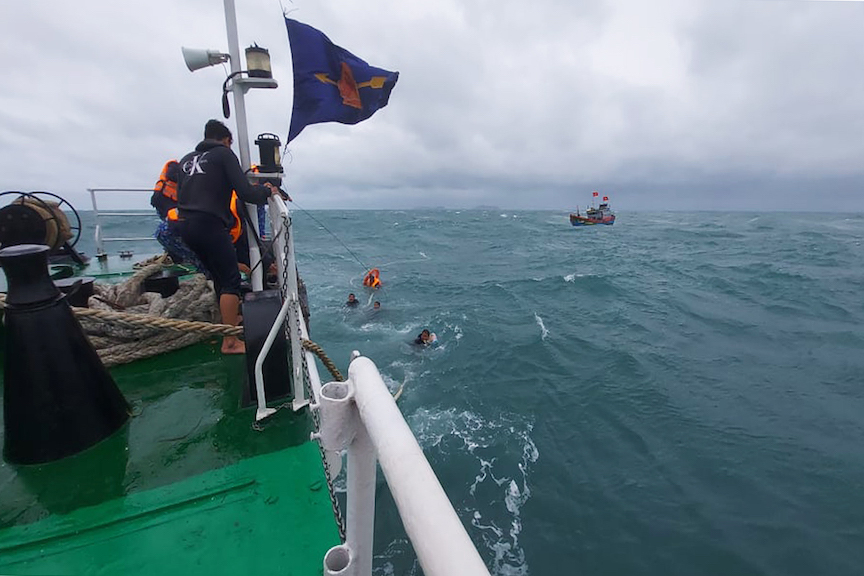 | Tàu CSB cứu hộ các ngư dân bị nạn vào sáng 23/2 (Ảnh: Cảnh sát biển) |