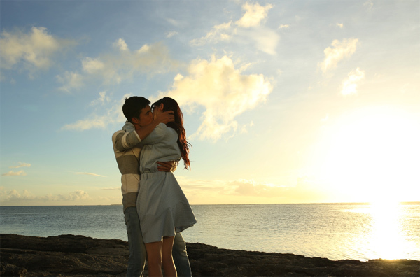 Diễn viên Quang Sự và nữ diễn viên xinh đẹp Nhật Bản Miyagi Karin có những cảnh quay vô cùng lãng mạn trong bộ phim 'Dưới bầu trời xa cách'.