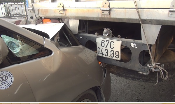 Cú tông cực mạnh khiến đầu xe biển xanh hư hỏng nặng, dính chặt vào đuôi xe tải, tài xế bị thương nặng, kẹt cứng trong cabin