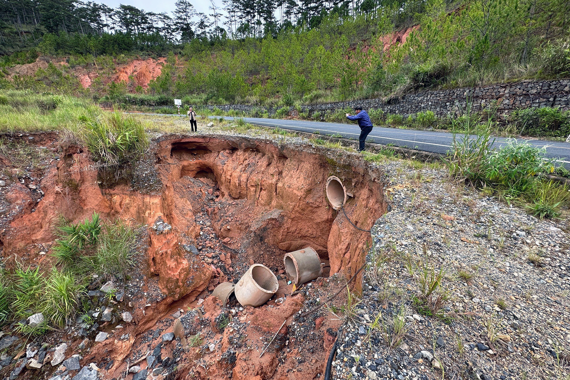 Không chỉ khu vực trên, một điểm khác tại Km108+50 tại xã Đạ Sar có đoạn đường dài chừng 30m sạt lở phía taluy âm, kéo theo một phần mặt đường nhựa nứt, bong tróc.