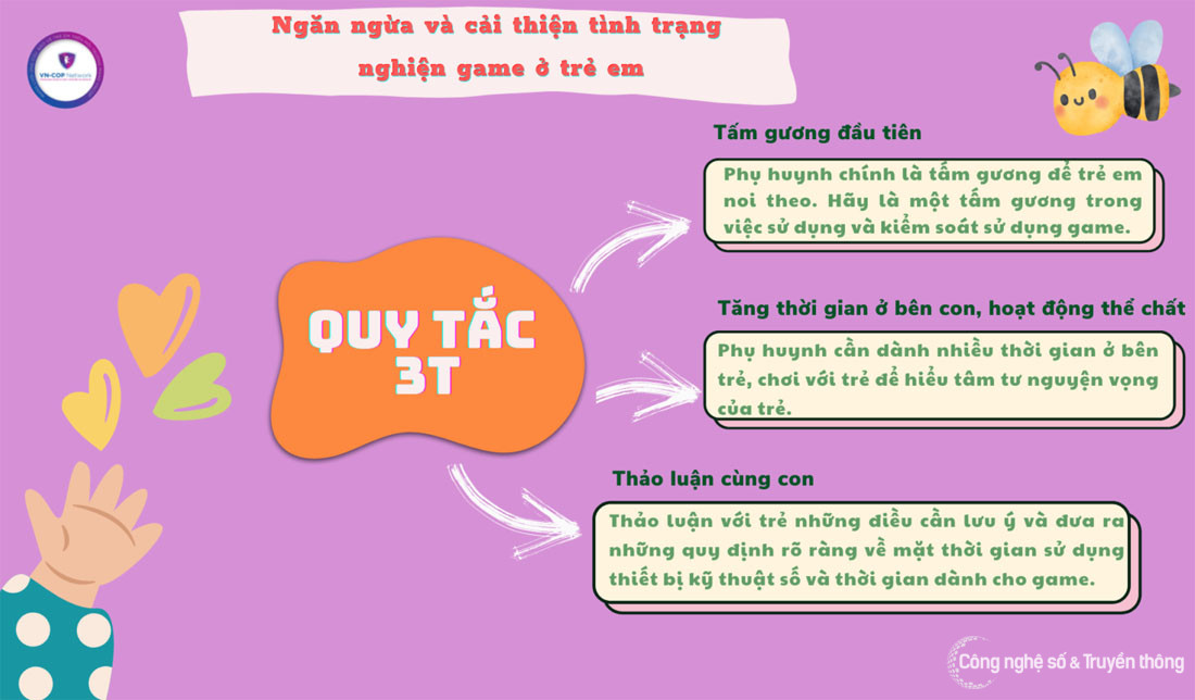 Cùng với việc chỉ ra những dấu hiệu để xác định việc nghiện game ở trẻ em, các chuyên gia Mạng lưới ứng cứu, bảo vệ trẻ em trên môi trường mạng cũng khuyến nghị “quy tắc 3T” giúp cha mẹ có thể ngăn ngừa và cải thiện tình trạng nghiện game ở trẻ em, đó là tấm gương đầu tiên, tăng thời gian ở bên con và hoạt động thể chất, thảo luận cùng con.