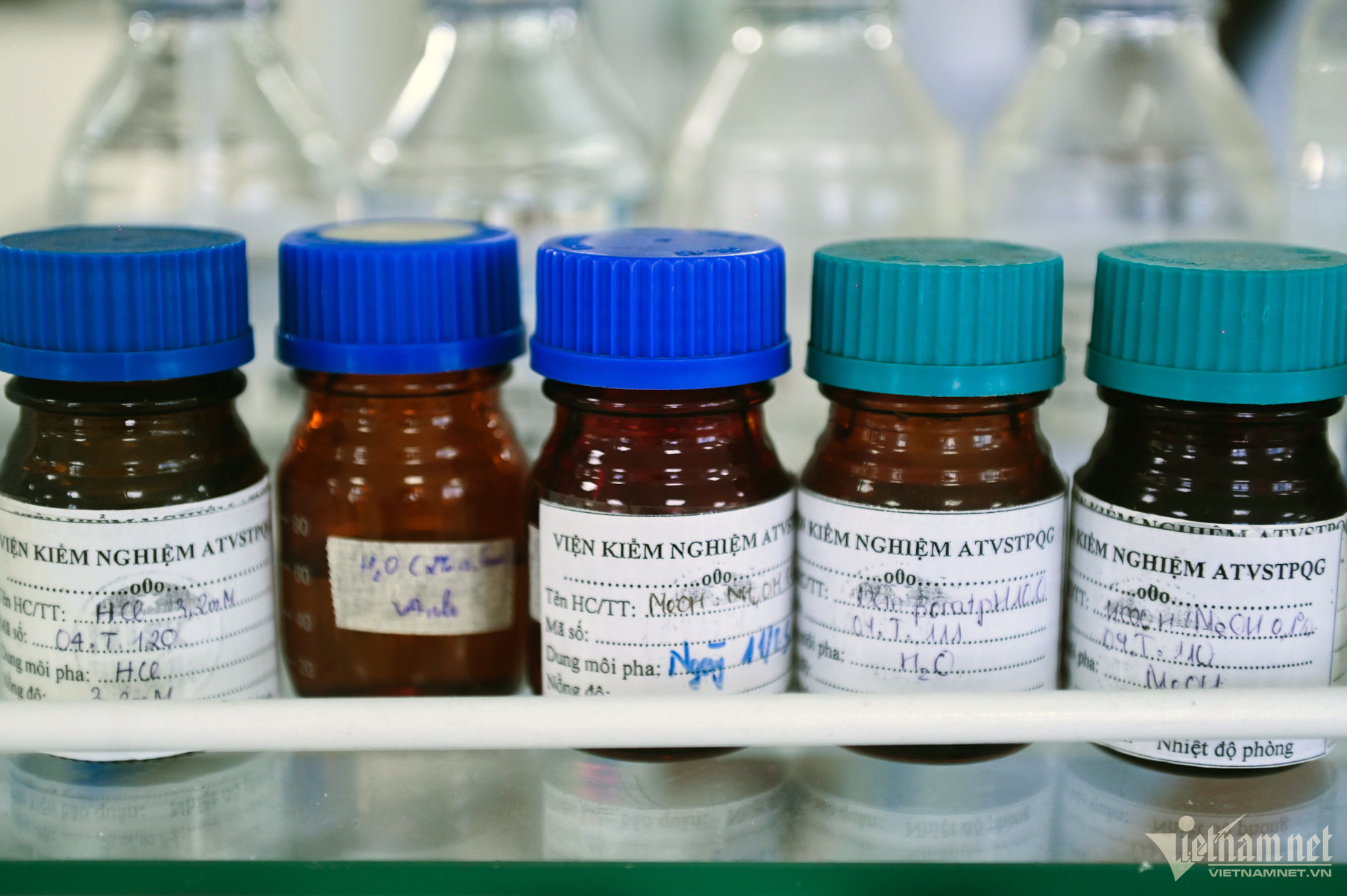 “Làm sao để cho kết quả nhanh nhất và chính xác nhất” là áp lực lớn nhất mà các kiểm nghiệm viên tại đây luôn thường trực khi tiếp nhận bất kỳ vụ ngộ độc thực phẩm nào. Tại Viện Kiểm nghiệm ATVSTP Quốc gia luôn có ê-kip trực ngộ độc, tiếp nhận mẫu và tiến hành kiểm nghiệm. Quy trình thực hiện kể cả ngoài giờ, cuối tuần hay ngày lễ, Tết. Trong ảnh, các kiểm nghiệm viên phối trộn dung môi vào mẫu thực phẩm chuẩn bị sẵn.