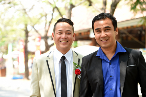 MC Quyền Linh đi dép lê, ôm chân vợ để chụp hình