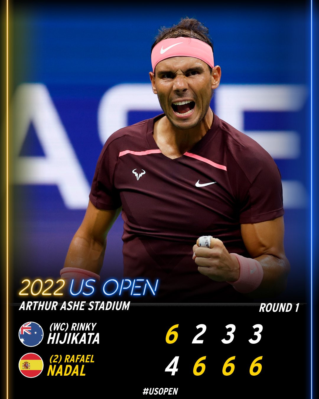 Rafael Nadal khởi đầu không tốt khi để thua 4-6 ở set ra quân trước Rinky Hijikata, tuy nhiên sau đó hạt giống số 2 ngược dòng thắng 6-2, 6-3 và 6-3 để ghi tên mình vào vòng 2 US Open 2022.