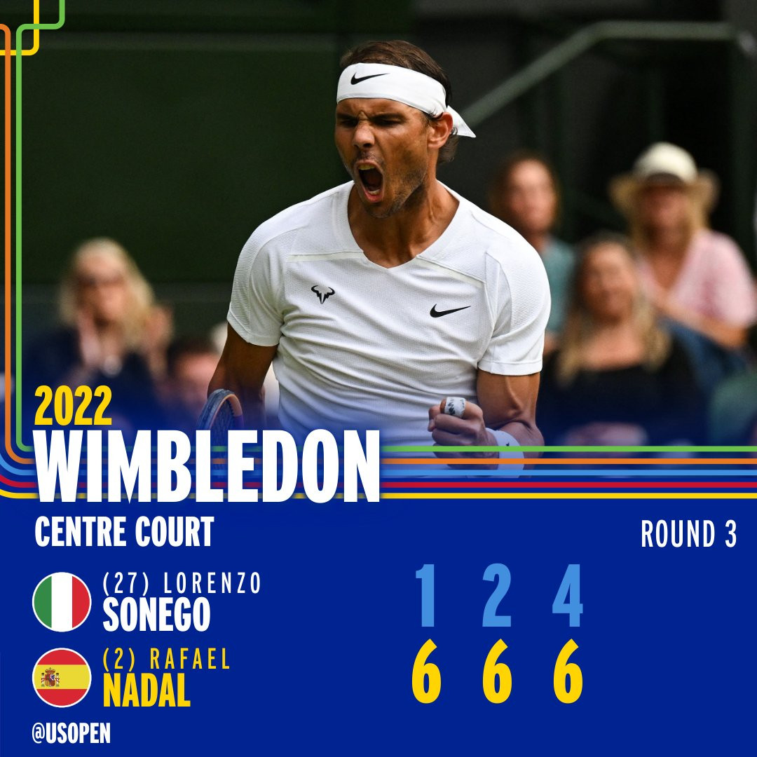 Rafael Nadal dễ dàng giành quyền vào vòng 4 Wimbledon 2022 sau khi vượt qua Lorenzo Sonego sau 3 set với tỷ số 6-1, 6-2 và 6-4.