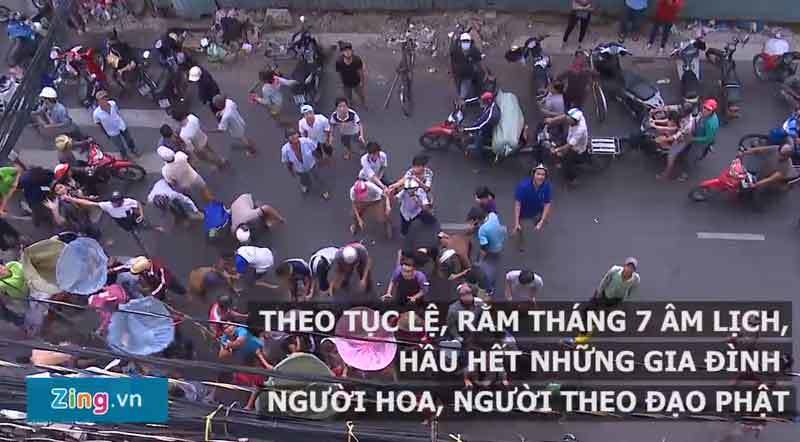 Khi tiền lẻ cúng cô hồn được ném xuống, hàng trăm người cầm sẵn vợt hứng và lao vào giành giật làm náo loạn cả khu phố Trần Hưng Đạo (TP HCM) chiều 17/8.