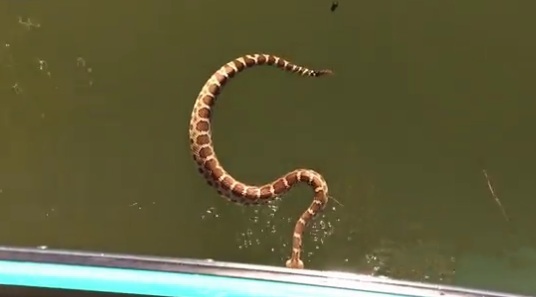Nhóm du khách đã có một phen hoảng sợ vì bất ngờ bị một con rắn đuôi chuông "khổng lồ" đột kích khi thuyền đang lênh đênh giữa hồ.