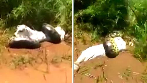 Xem rắn Anaconda khổng lồ siết chết bò dưới sông