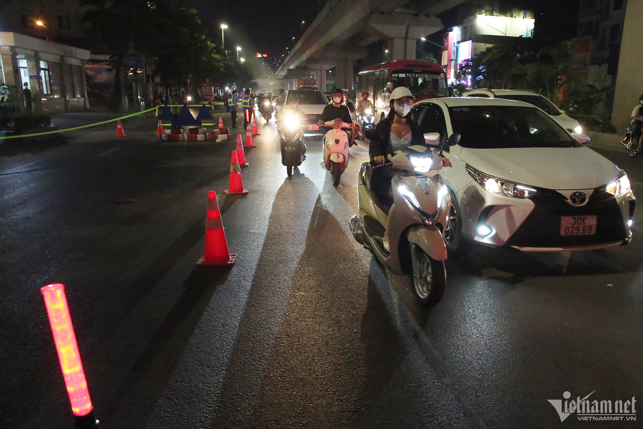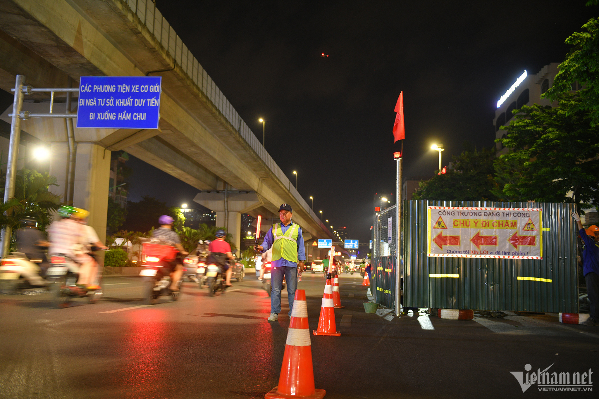 Từ 21h30 ngày 9/6, công nhân bắt đầu dựng rào chắn tại đối diện ngõ 495 Nguyễn Trãi (Thanh Xuân, Hà Nội) để thi công hố ga 13/1.7 thuộc gói thầu số 2 hệ thống xử lý nước thải Yên Xá.