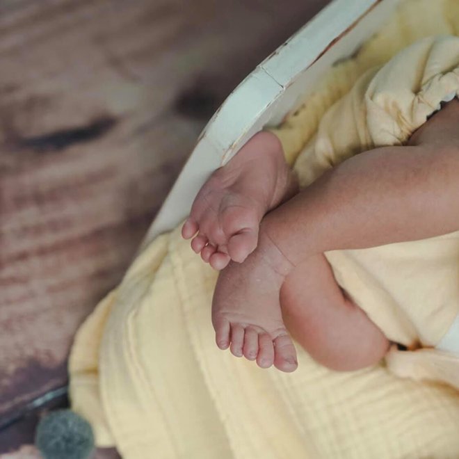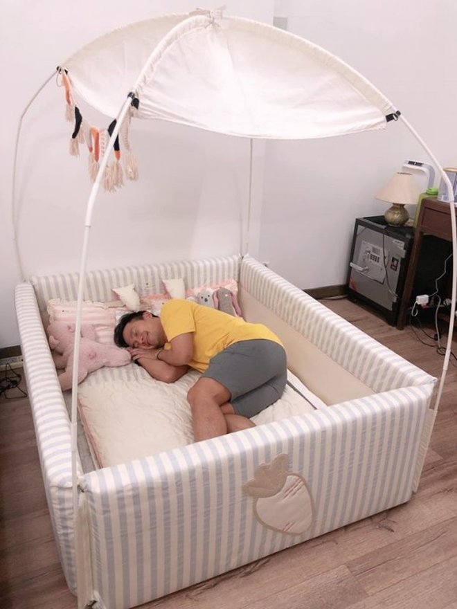 Nam rapper hài hước khoe ảnh nằm gọn trong chiếc nôi lớn của em bé.