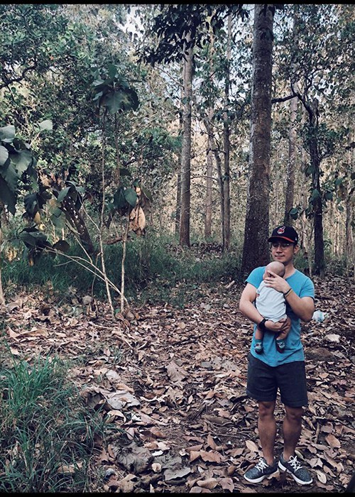 Tiến Đạt thể hiện hình ảnh một người cha yêu thương con, phụ vợ chăm sóc con. Anh bế con đi thư giãn ngoài trời.