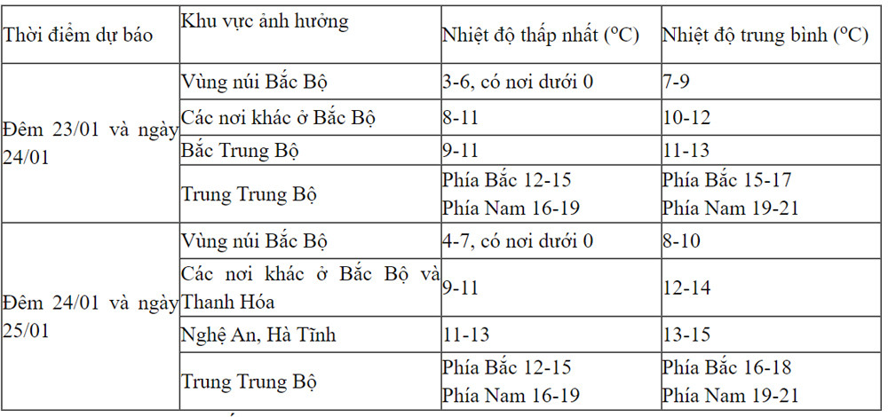 "Trong đợt không khí lạnh này, nhiệt độ thấp nhất ở Bắc Bộ phổ biến 7-10 độ C, khu vực vùng núi Bắc Bộ phổ biến dưới 5 độ C, vùng núi cao có nơi dưới 0 độ C và tiếp tục có khả năng xảy ra hiện tương băng giá.