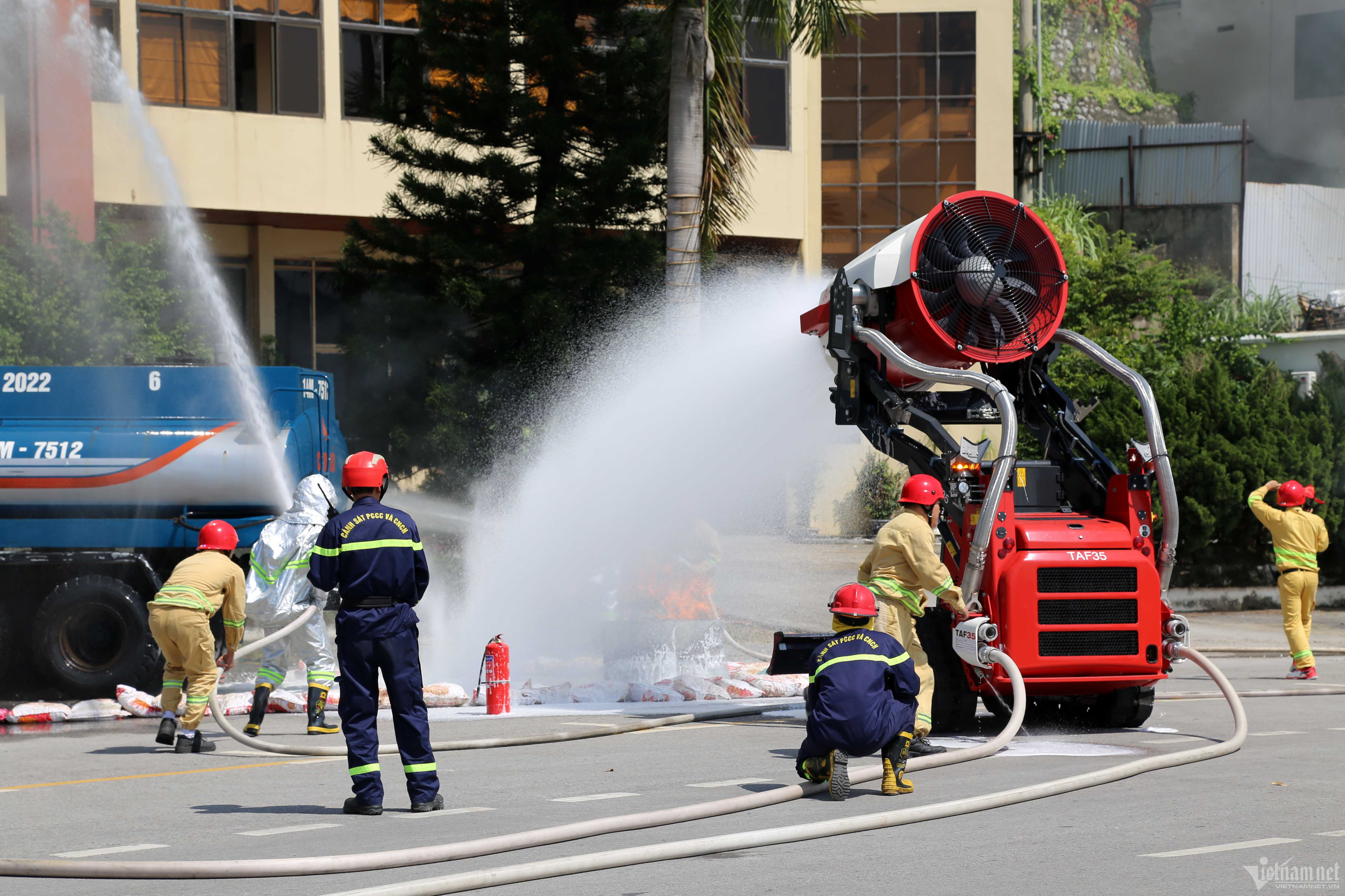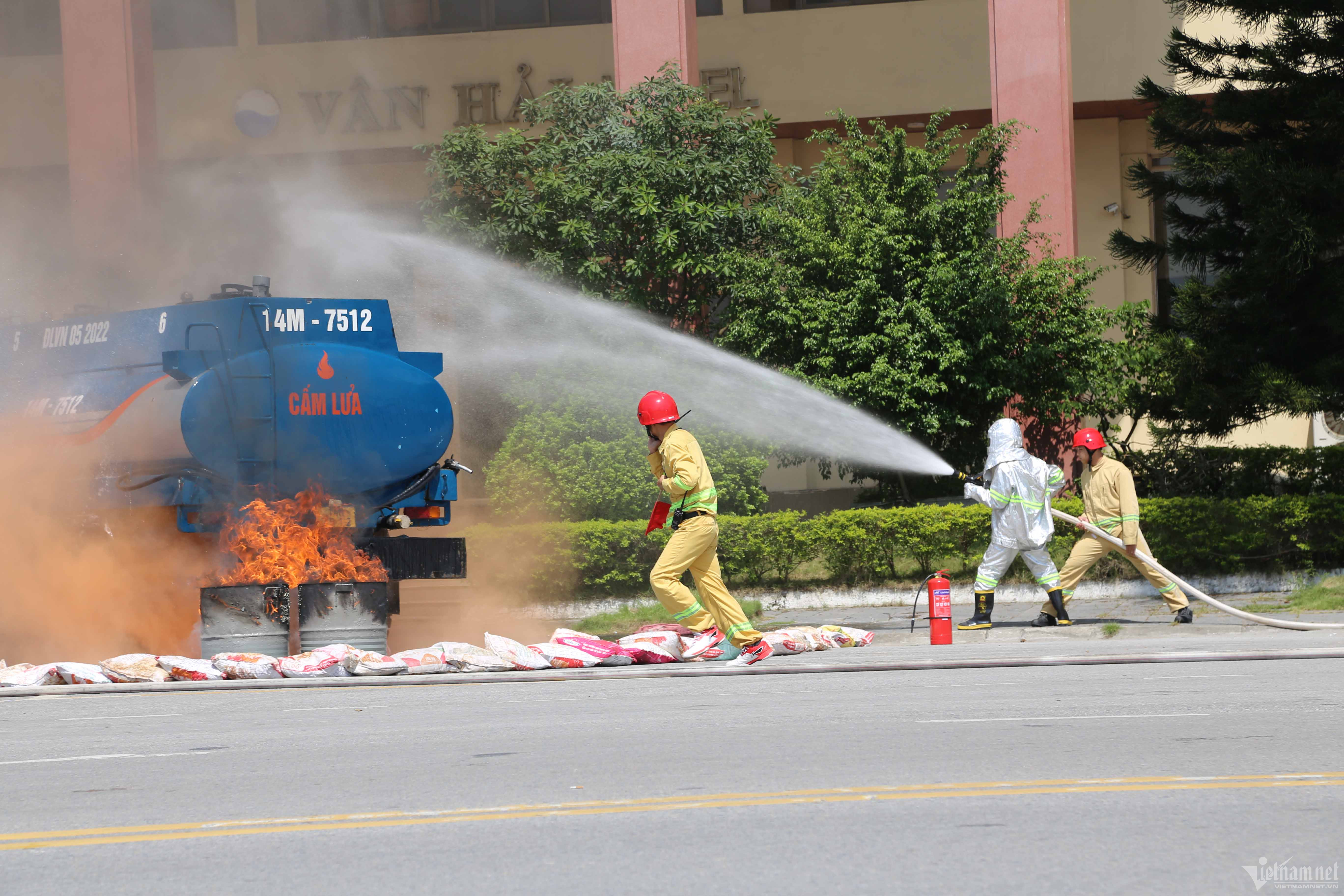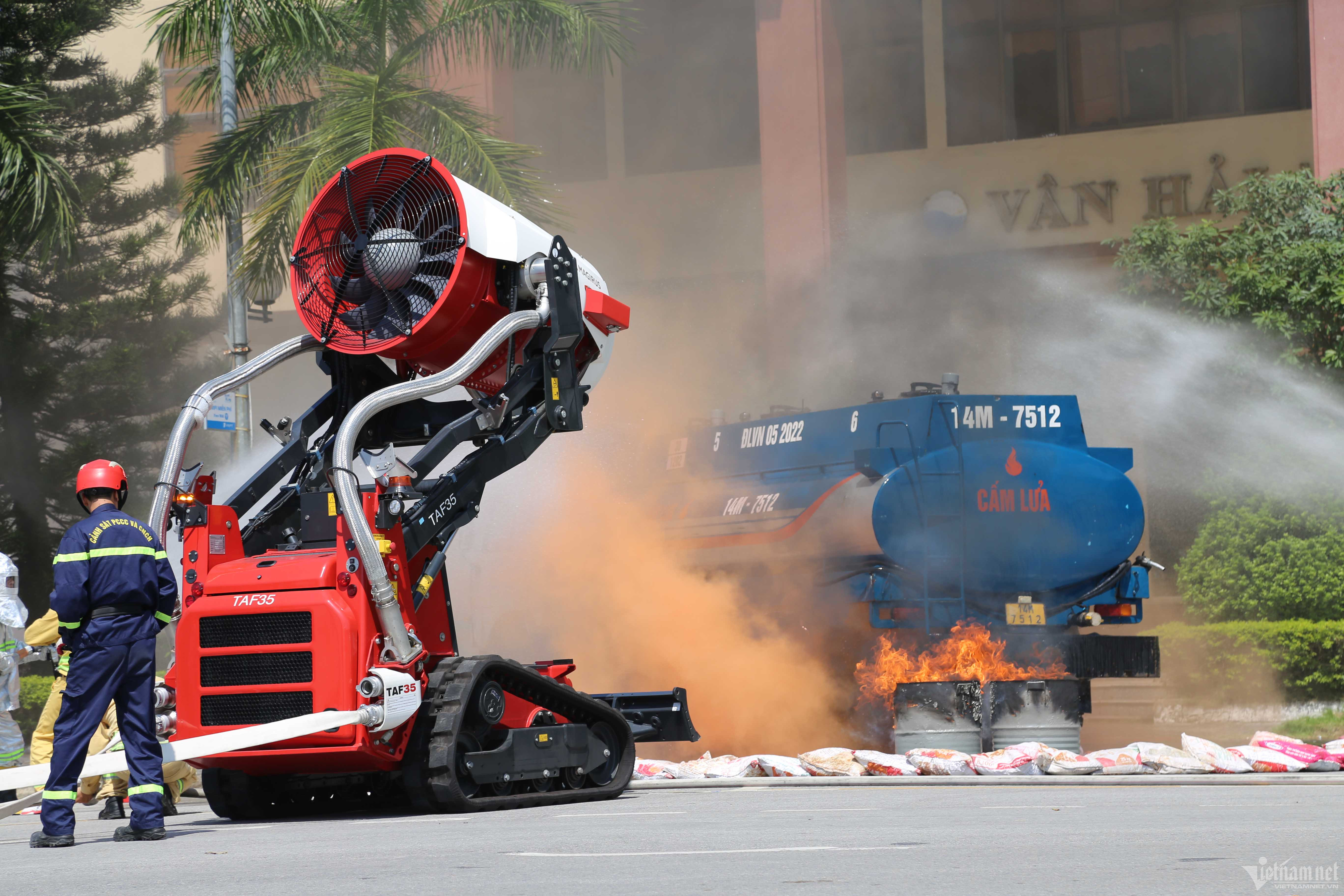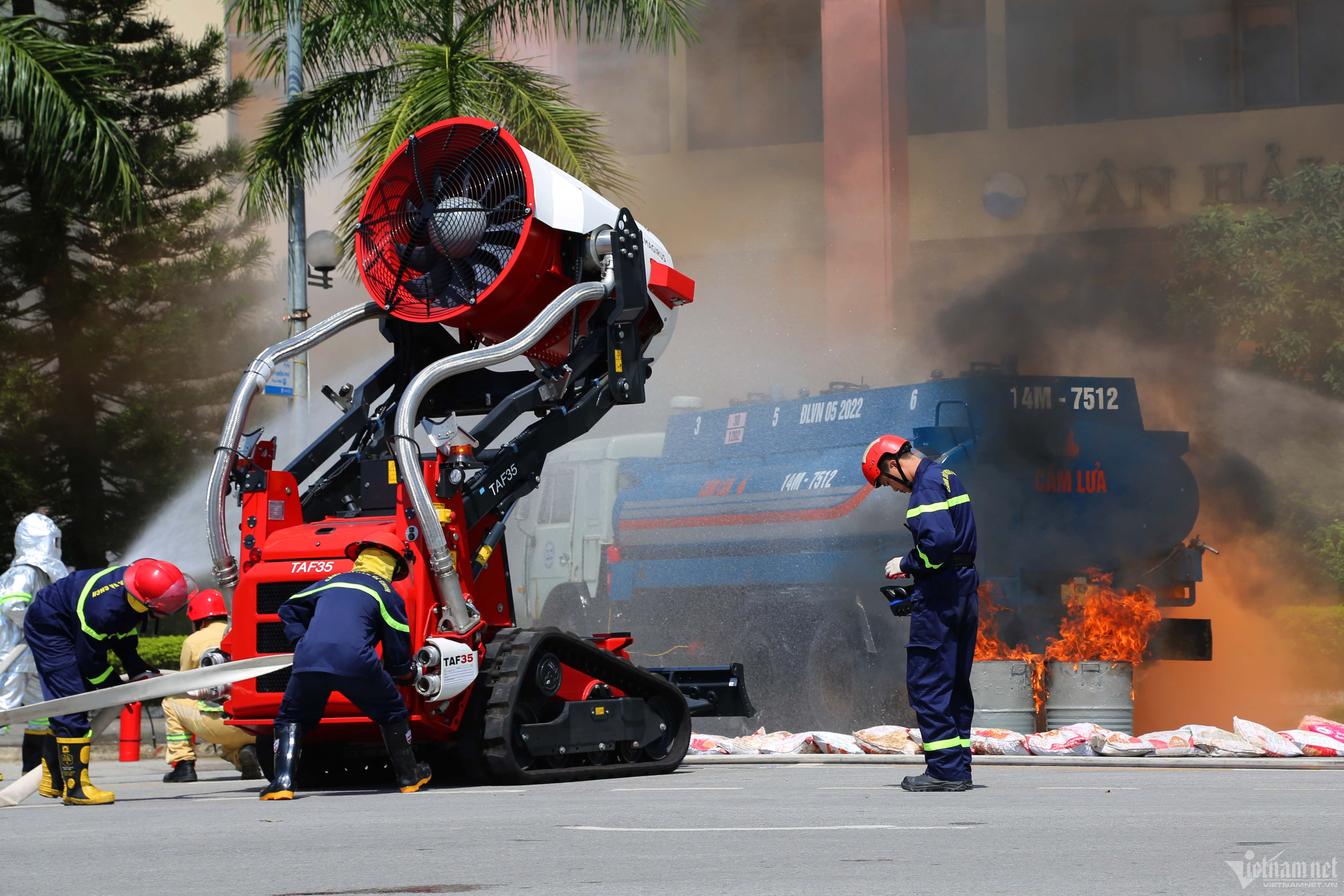 Buổi diễn tập còn đặt ra tình huống xe bồn chở xăng do mất tập trung, tránh người nên đâm vào xe chở hóa chất làm xăng chảy tràn và hóa chất axit nitric loại A rò rỉ ra bên ngoài... Lúc này, rô bốt chữa cháy được đưa đến hiện trường để tiếp cận dập lửa.