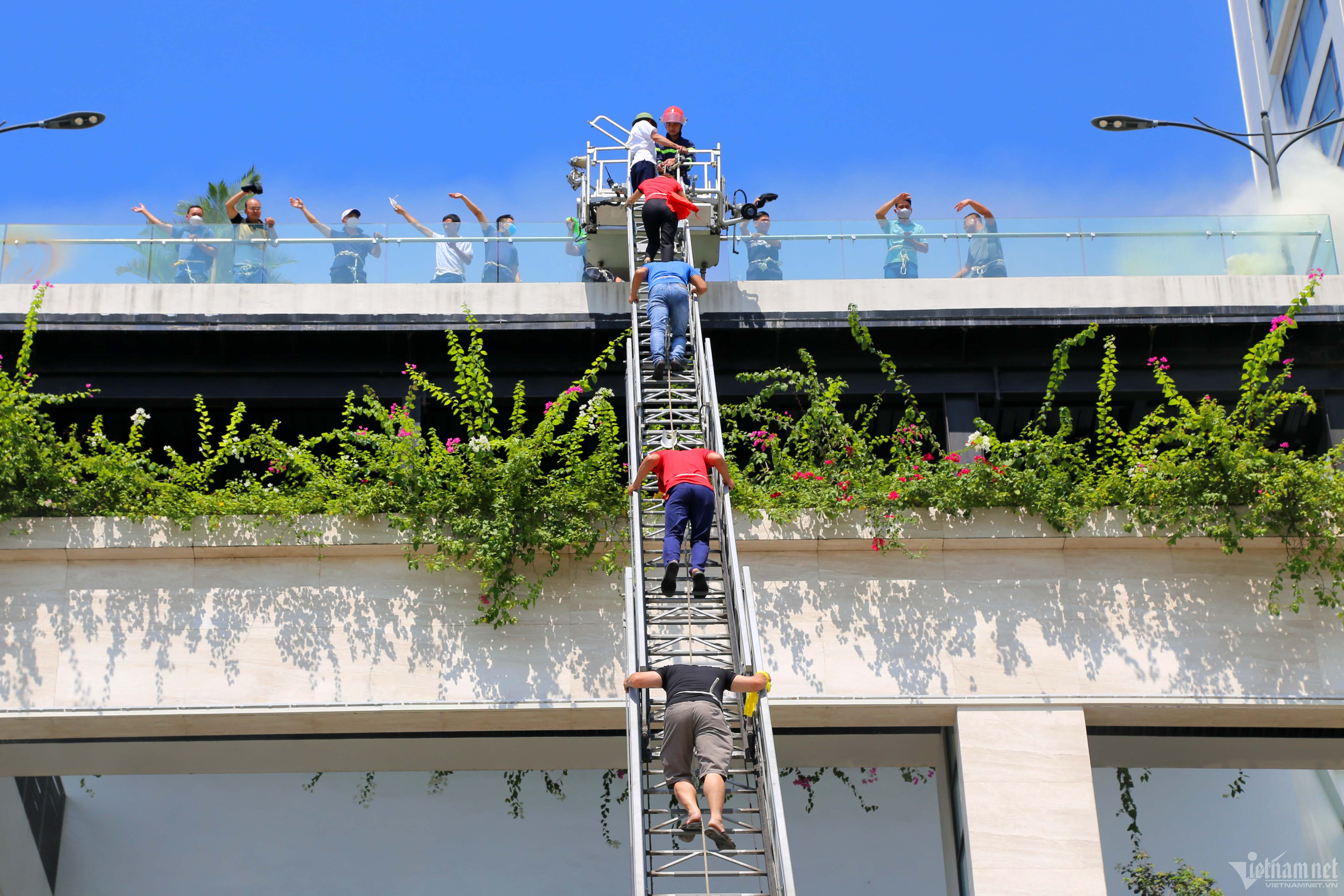 Hai máy bay trực thăng của Trung đoàn Không quân 916, Sư đoàn không quân 371 được huy động đến hiện trường tham gia tìm kiếm, cứu hộ trên phần mái của 2 tòa nhà giả định cháy.