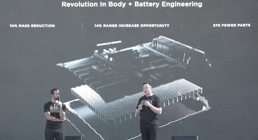 Kết hợp với quy trình đúc các bộ phận siêu lớn mới được áp dụng, Tesla có thể ghép nối phần trước và sau xe vào bộ khung pin liền bên dưới để thành một khối thống nhất. Thiết kế mới giúp giảm số lượng linh kiện lắp ráp, cũng như tổng khối lượng chiếc xe, cho phép Tesla cải thiện hiệu quả năng lượng cũng như tầm hoạt động của chiếc xe điện.