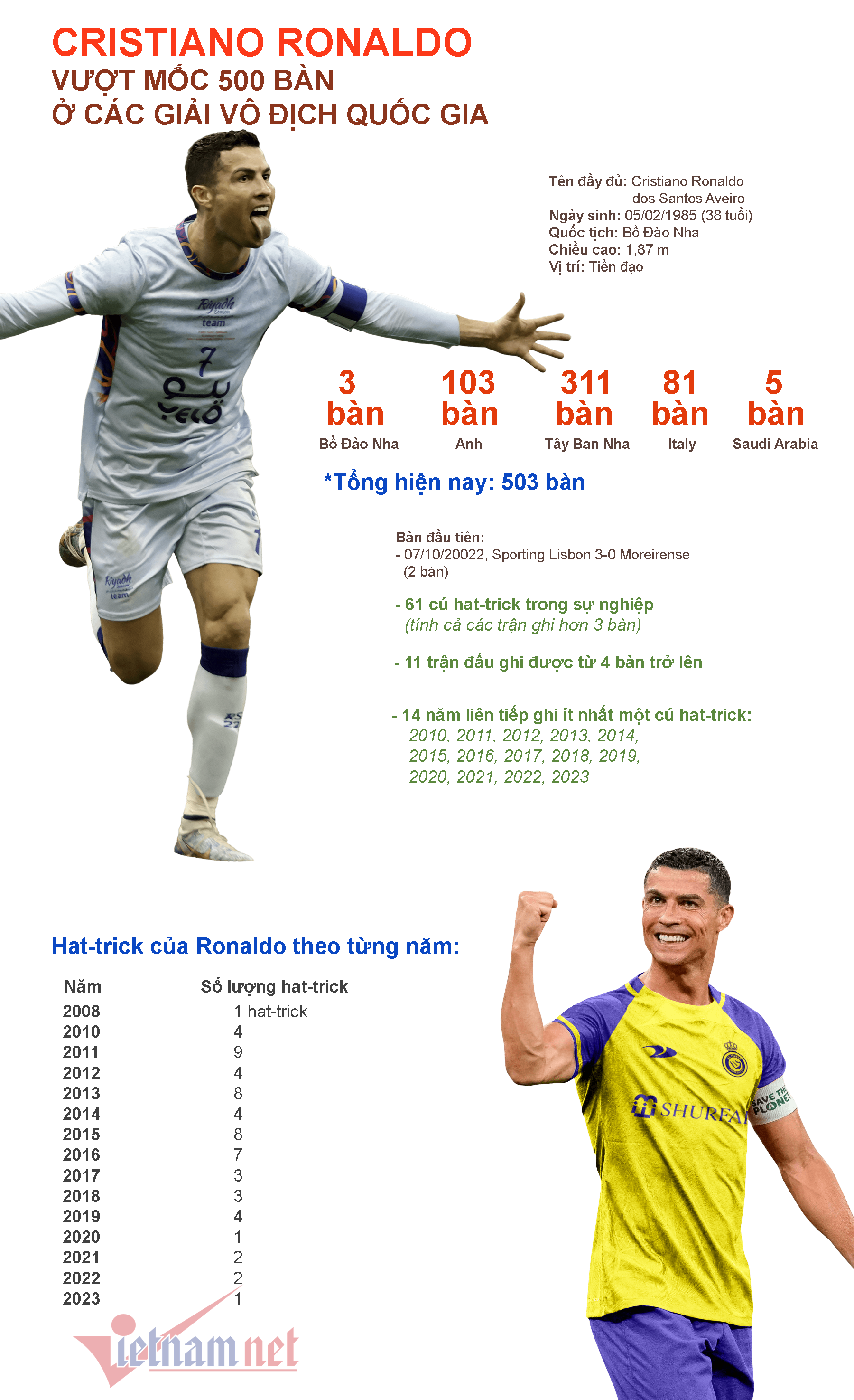 Ronaldo - người vừa đón sinh nhật 38 cách nay 5 ngày - cũng chính thức vượt qua mốc 500 bàn thắng tại các giải vô địch quốc gia.