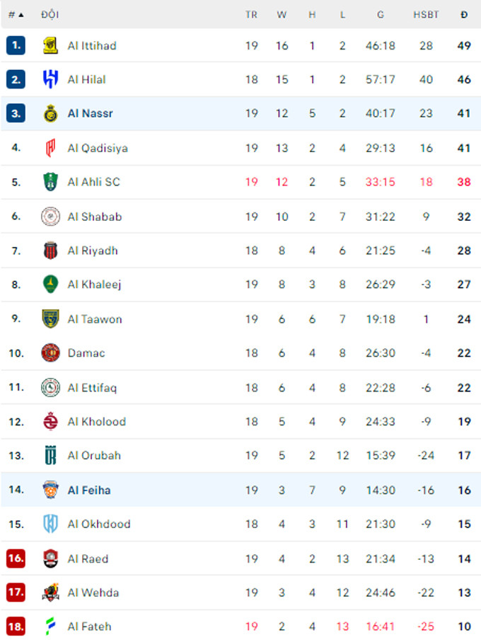 Thắng trận 3-0 giúp Al Nassr đòi lại vị trí thứ 3 Saudi Pro League. Ronaldo và đồng đội có cùng 41 điểm sau 19 trận như đội xếp sau Al Qadisiyah nhưng hơn hiệu số. Tuy nhiên, khoảng cách giữa họ và đội đầu bảng Al Ittihad vẫn là 8 điểm.