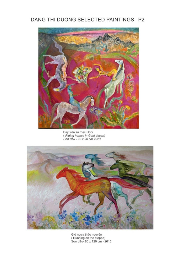 Trong nhóm, họa sĩ Đặng Thị Dương là người cao tuổi nhất. Tình yêu hội họa giúp bà trẻ, tâm hồn lãng mạn và bay bổng với nét cọ. Niềm hạnh phúc của bà giờ đây là ngoài thời gian dành cho gia đình, chỉ mong được ngồi vào góc riêng để đắm mình trong sáng tác.