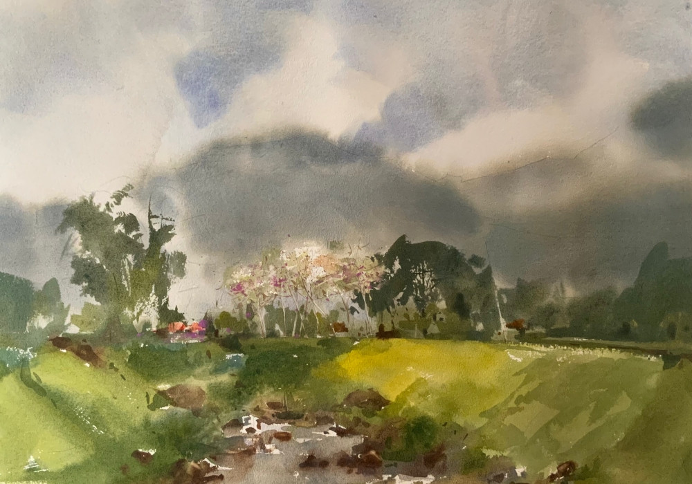 Trong số 35 tác phẩm, họa sĩ đặc biệt tâm đắc vài tranh. Trong đó, bức Sa mưa giông chất chứa nhiều cảm xúc từ ý tưởng đến khi hoàn thành. Họa sĩ kể trong một chuyến công tác ở Cần Thơ, anh thấy trời chuyển mưa, mây đen, gió kéo tới, sông cuồn cuộn chảy, còn con thuyền chở người vẫn lao đi. Bất giác, anh quyết định vẽ lại khoảnh khắc này vì cảm nhận nó giống đời sống, dẫu có thế nào vẫn phải tiến về phía trước.