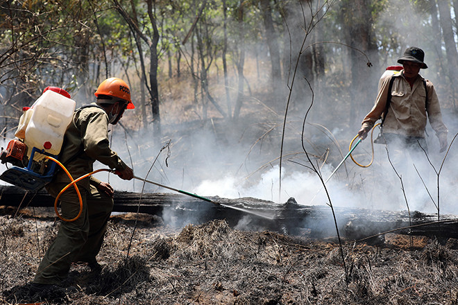 Hơn 30 người gồm kiểm lâm, dân quân, người dân… tiến hành dập lửa. Tới chiều nay đã cơ bản khống chế được đám cháy.