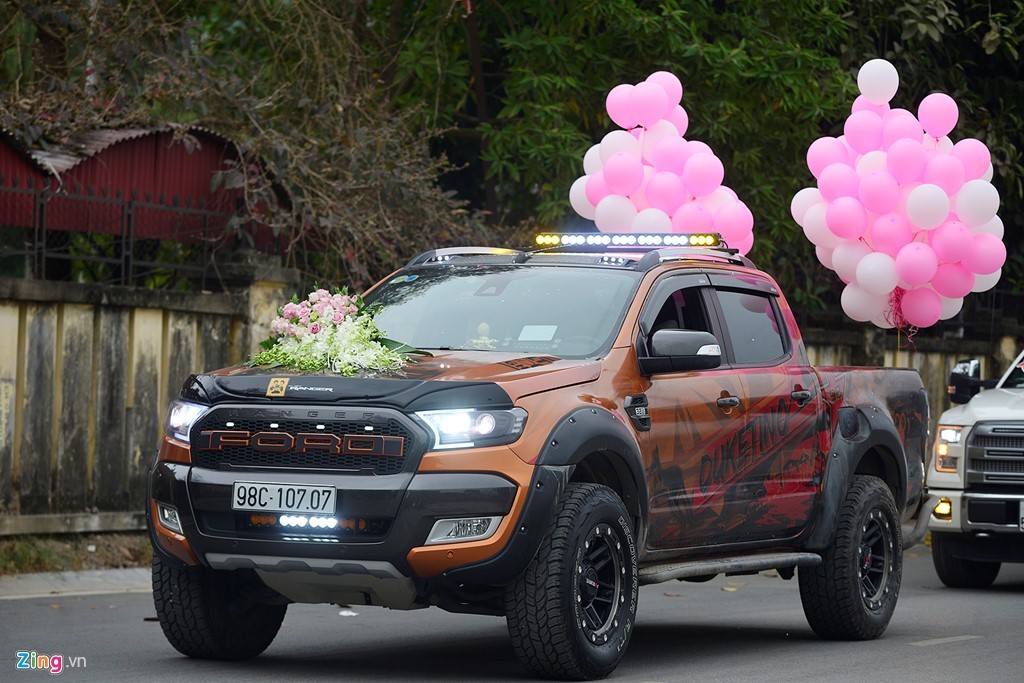 Một đoàn xe bán tải với 50 chiếc, trong đó chủ yếu là dòng Ford Ranger, vừa thực hiện chuyến đón dâu dài hơn 2 km quanh hồ Tây sáng 8/1.