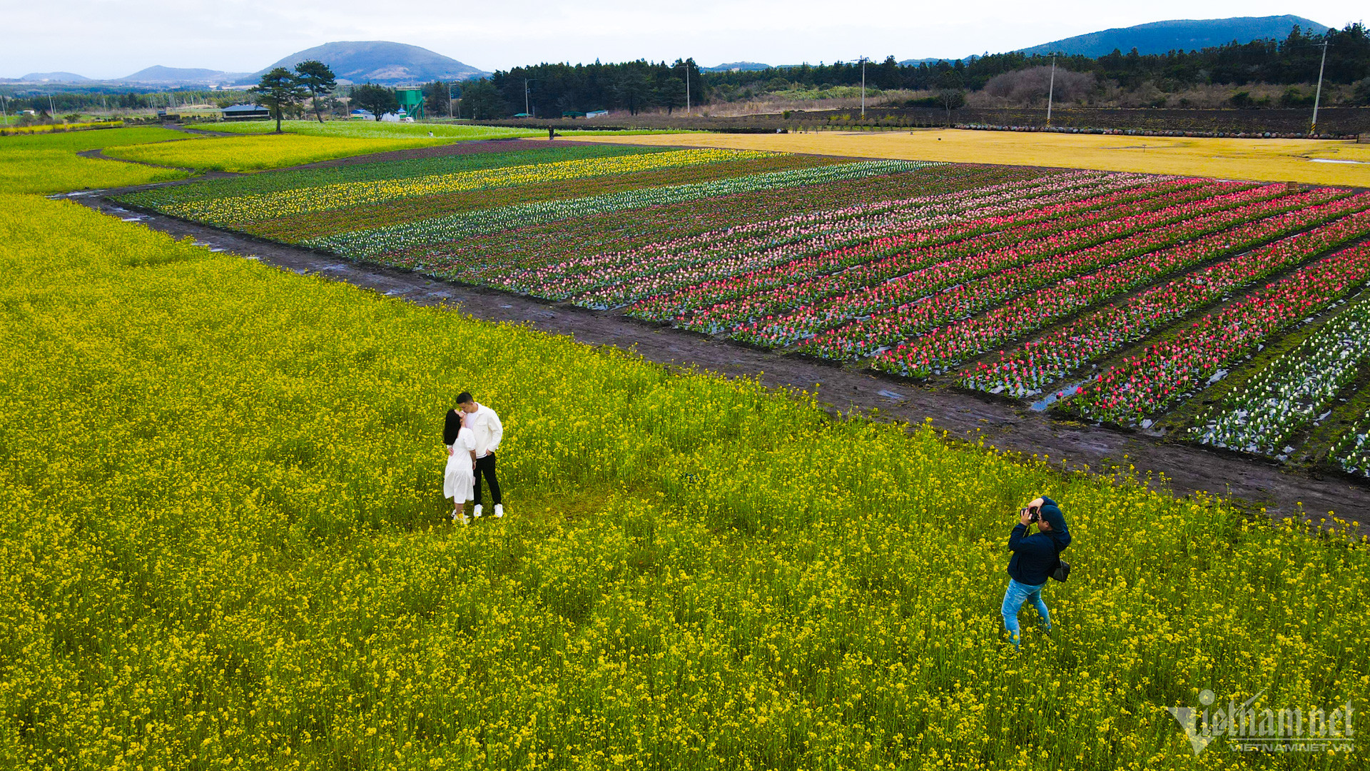 Jeju có một cánh đồng tulip mang tên Borom Wat với những luống hoa được trồng và chăm sóc kỹ lưỡng. Hầu như du khách nào đến thành phố đảo đều phải qua đây check-in. Không quá rầm rộ, nhưng Borom Wat như một địa điểm "bỏ túi" của những tín đồ du lịch. Khi hè tới, cánh đồng này sẽ được phủ đầy hoa cẩm tú cầu đủ màu sắc. Còn đến mùa lạnh, nông dân làm lại luống đất, bắt đầu vào vụ tulip và hoa cải dầu. Lúc đó, những luống hoa đủ màu sắc khỏe khoắn đua nở, trải dài và rộng, mênh mông tầm mắt, bất cứ ai nhìn thấy cũng có thể dạt dào xúc cảm.