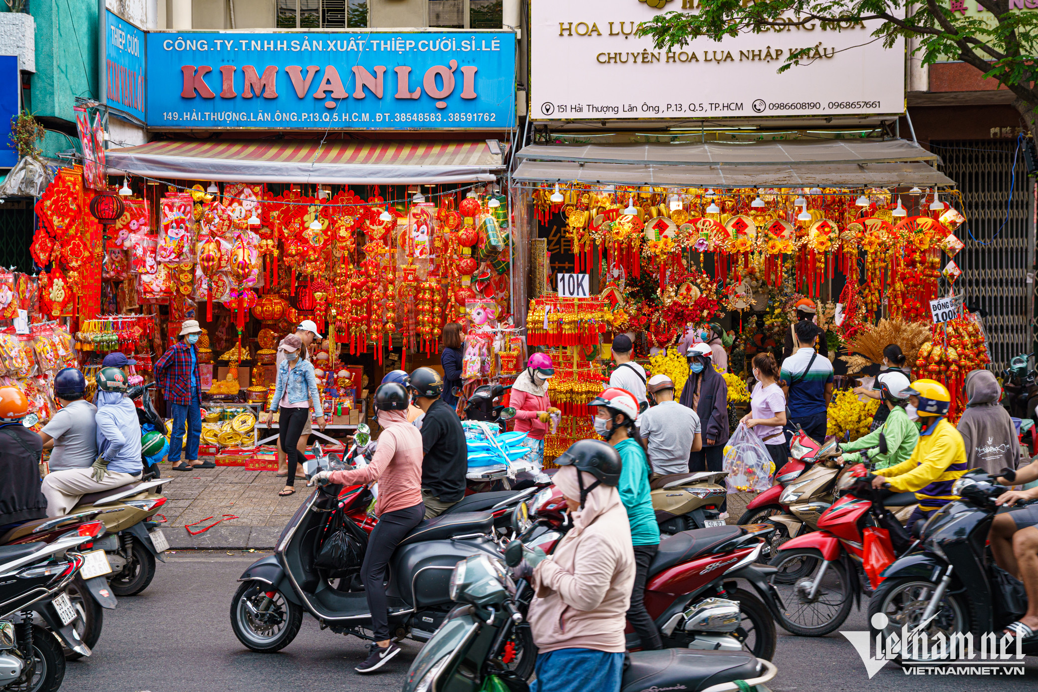 Đường Hải Thượng Lãn Ông (quận 5), một trong những địa điểm bán đồ trang trí theo mùa nhộn nhịp nhất TP.HCM hôm nay cũng trong cảnh tấp nập người và xe.