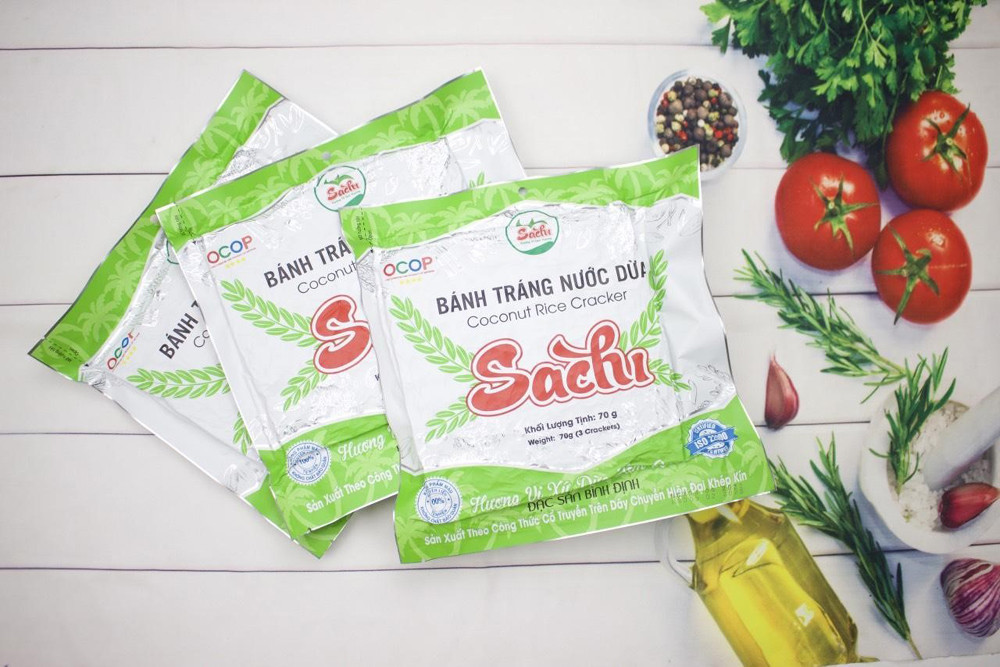 Món ăn truyền thống, nổi tiếng lâu đời của “đất võ” Bình Định nay được thương hiệu Sachi Foods biến tấu một cách sáng tạo, cho ra đời những chiếc bánh tráng đa dạng và phong phú với hương vị khác nhau như: bánh tráng gạo mè, bánh nước cốt dừa, rong biển, ruốc biển...