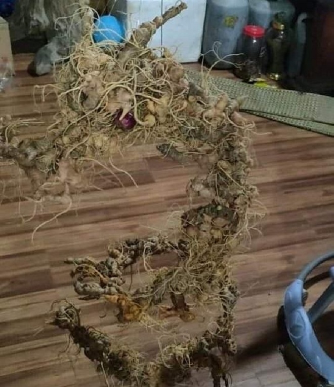 Ngày 6/1, chị Nguyễn Thị Hồng Thương (xã Trà Cang, huyện Nam Trà My, tỉnh Quảng Nam) cho biết vừa hoàn thành việc ghép tạo hình rồng từ 168 củ sâm Ngọc Linh theo đơn đặt hàng của khách. Ảnh: VTCNews