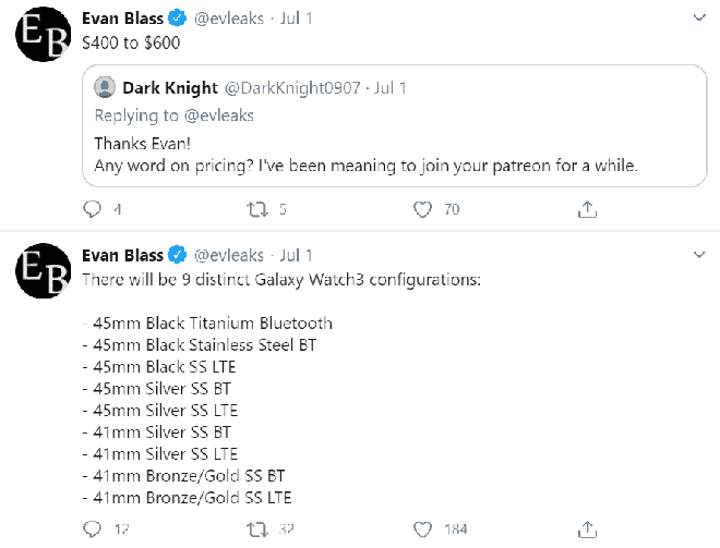 Galaxy Watch 3 sẽ được Samsung ra mắt vào ngày 22 tháng 7. Evan Blass cũng tiết lộ giá bán của chiếc smartwatch này sẽ từ 400 USD cho đến 600 USD. Đây là một mức giá khá cao so với các thế hệ Galaxy Watch trước đây.
