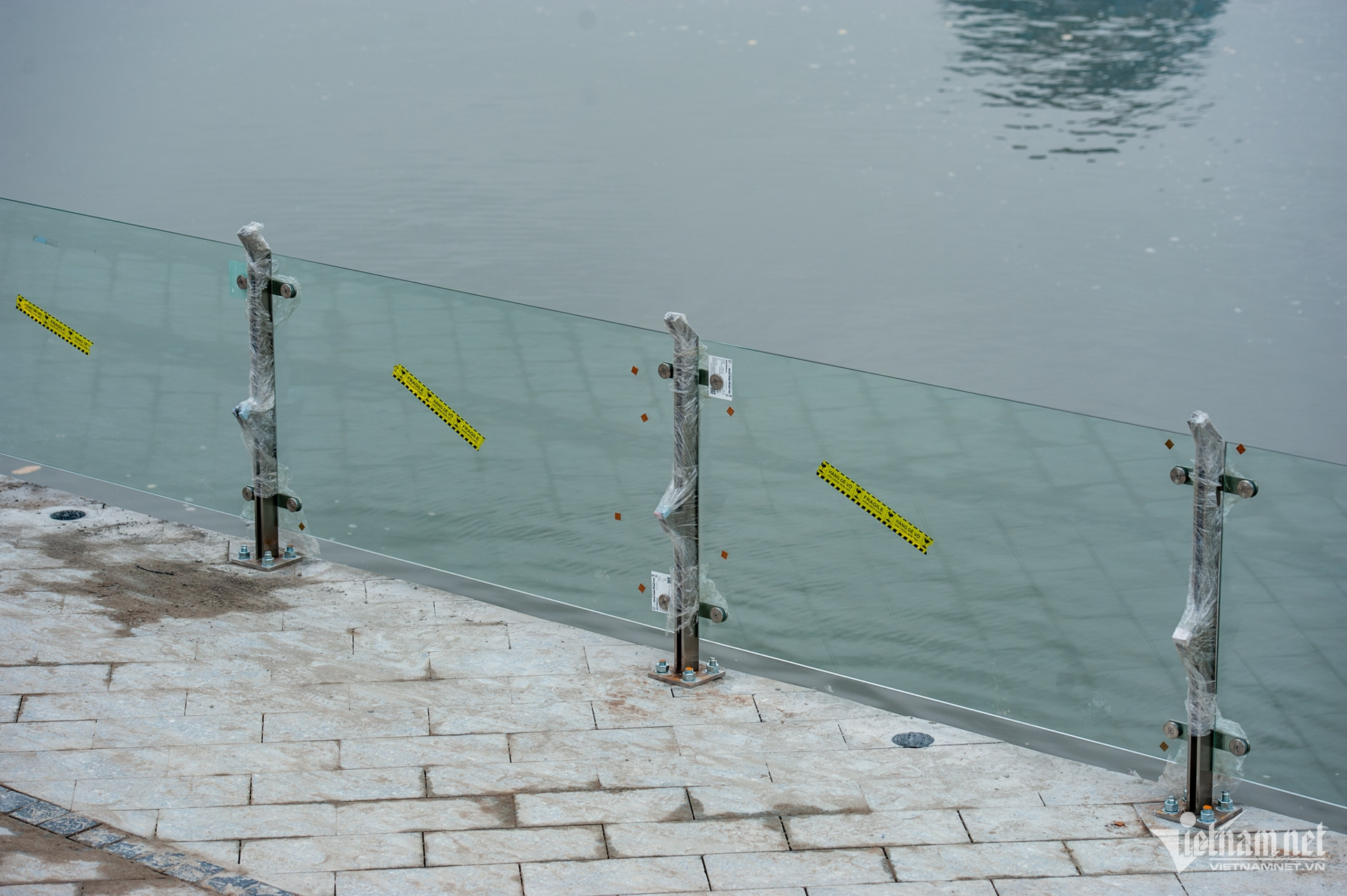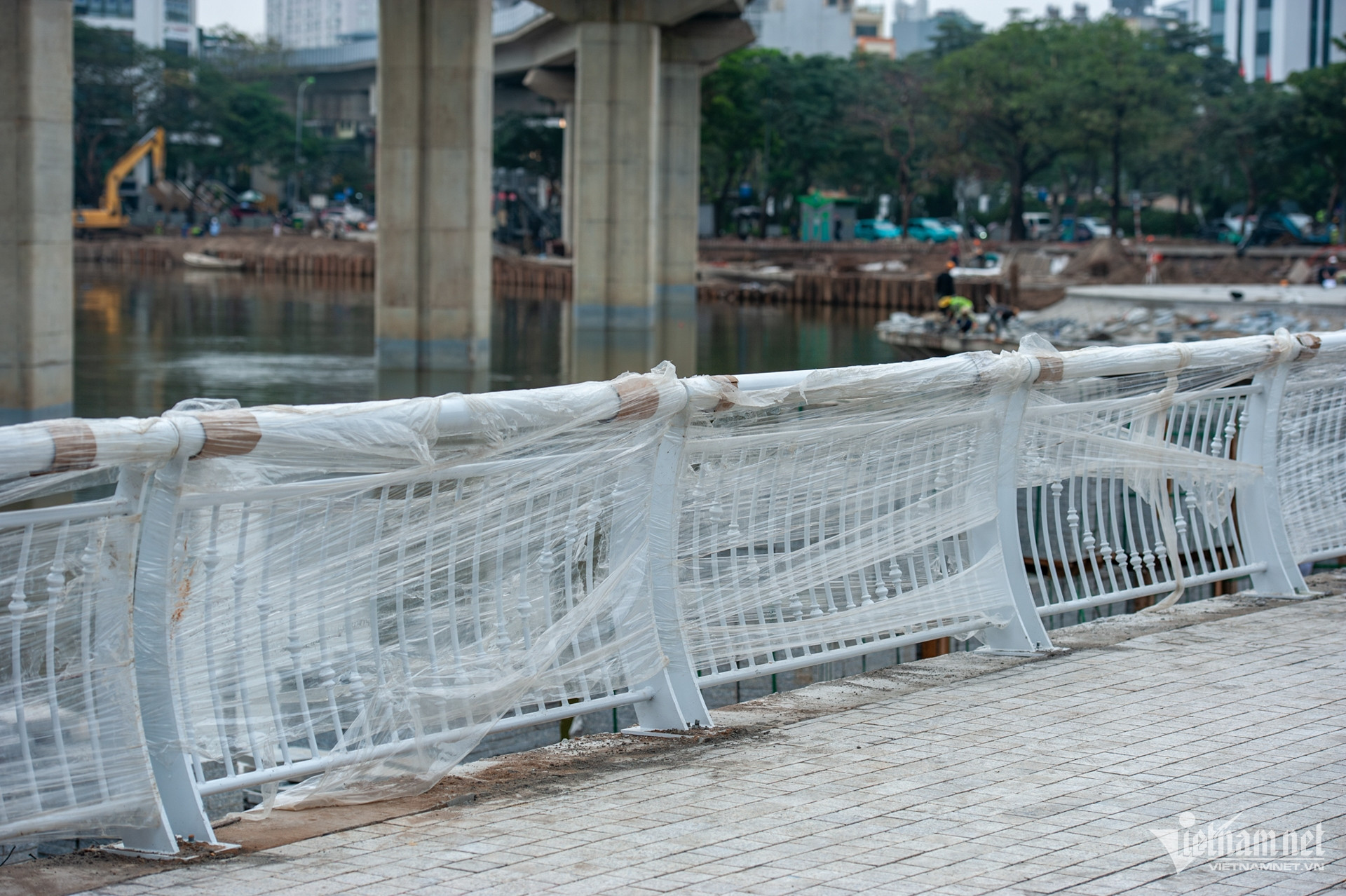 Một số vị trí đã được lắp đặt lan can và lát đá.