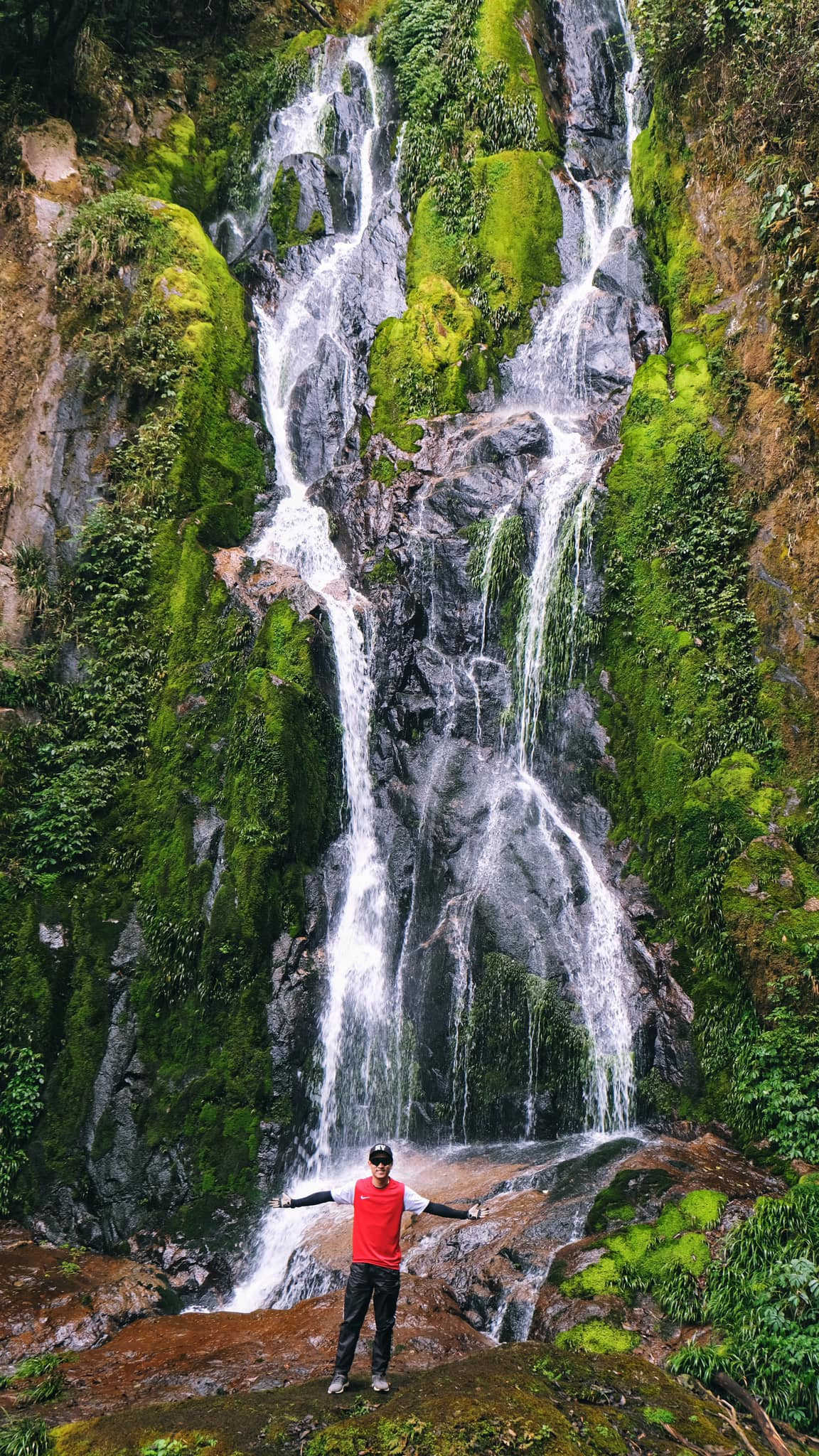 Trên cung đường mới từ đỉnh xuống chân núi, nam du khách đến từ TPHCM không khỏi ấn tượng với vẻ đẹp của thác Háng Xua (Ảnh: Lâm Hoàng Thiên Vũ)