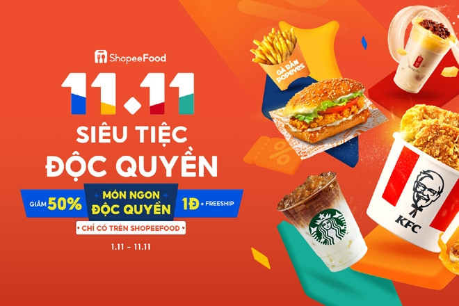 Tận hưởng các ưu đãi lớn như miễn phí vận chuyển, giảm 50%, “deal 1 đồng” trong siêu tiệc độc quyền diễn ra vào ngày 11/11 trên ShopeeFood.
