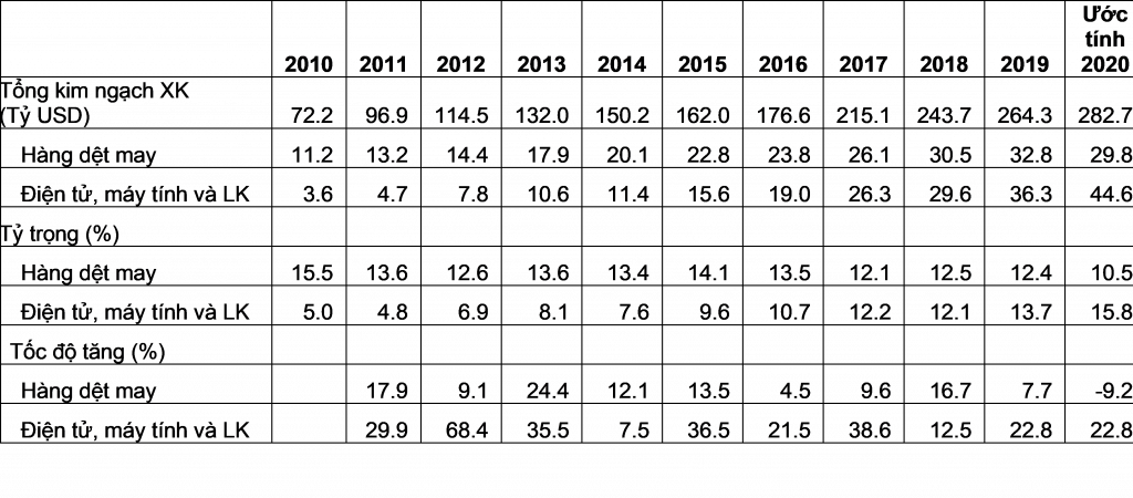 Đến năm 2020, mặc dù nền kinh tế chịu ảnh hưởng lớn của dịch Covid-19 nhưng nhóm hàng này vẫn đạt tốc độ tăng cao và ổn định vững chắc. Ước tính, giá trị xuất khẩu tiếp tục tăng mạnh, đạt 44,6 tỷ USD, tỷ trọng chiếm 15,8% tổng kim ngạch xuất khẩu, vượt xa xuất khẩu hàng dệt may cả về giá trị, tốc độ tăng và tỷ trọng (hàng dệt may đạt 29,8 tỷ USD, tỷ trọng chiếm 10,5%).