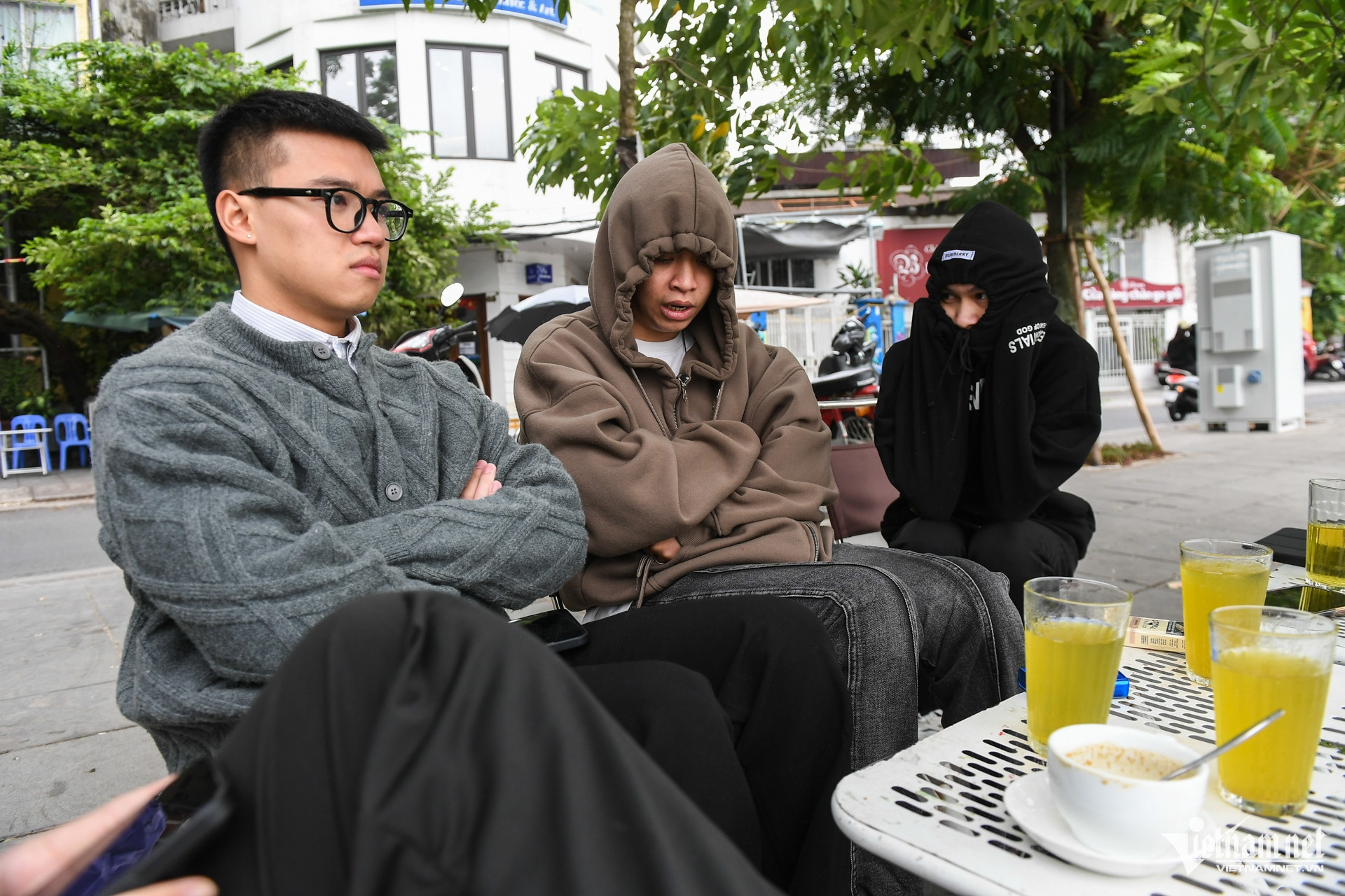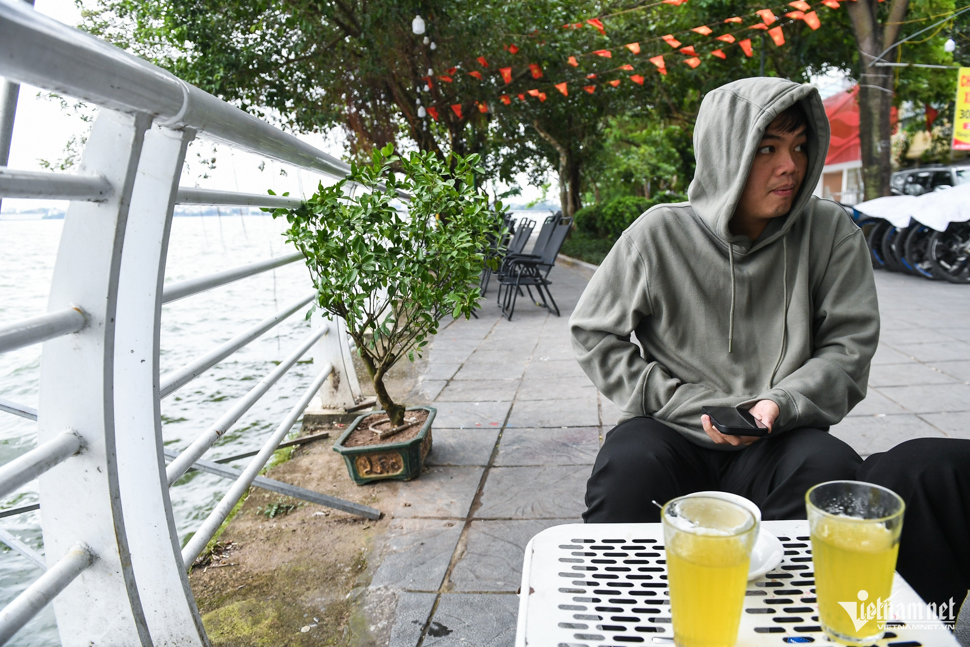 Trần Đạt (áo đen) cùng nhóm bạn hẹn nhau tại một quán cà phê ven hồ. Cả 4 thanh niên đều rúm ró, trùm kín mũ khi ngồi uống nước. "Chúng tôi phải gọi đồ uống nóng, uống cho ấm người", Đạt nói.