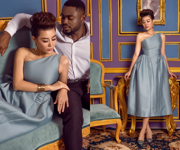 Trương Thị May đẹp bay bổng trong bộ cánh xếp tầng cầu kỳ. Màu trắng tinh khôi của bộ cánh được điểm xuyết bởi mái tóc đen thả xoã tạo nên sắc thái tương phản cuốn hút. Kiểu dáng mullet của bộ cánh cũng giúp người đẹp tôn lên cặp chân dài quyến rũ.