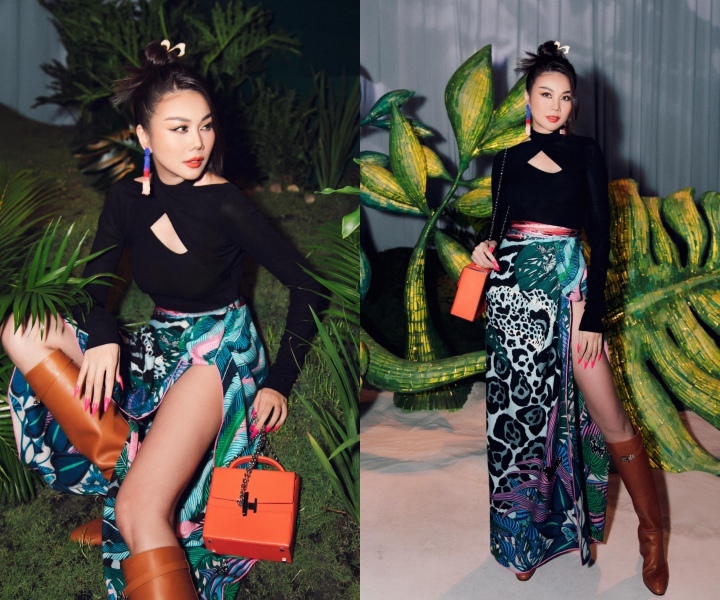 Không chỉ gây ấn tượng với mái tóc được cột cầu kỳ, Thanh Hằng khiến người hâm mộ thích thú khi biến tấu chiếc khăn đắt đỏ của thương hiệu Hermes thành váy xẻ tà gợi cảm. Nữ siêu mẫu kết hợp cùng áo dài tay khoét ngực trơn màu nhằm tôn lên tối đa đường nét chiếc váy. Thanh Hằng đồng thời lựa chọn túi xách màu cam nổi bật cùng boots cao xuyệt tông từ thương hiệu danh tiếng này.