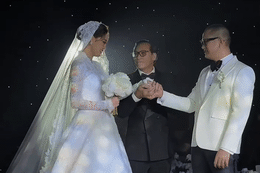 Vợ chồng Ưng Hoàng Phúc tay trong tay tình cảm đi ăn tiệc cưới.