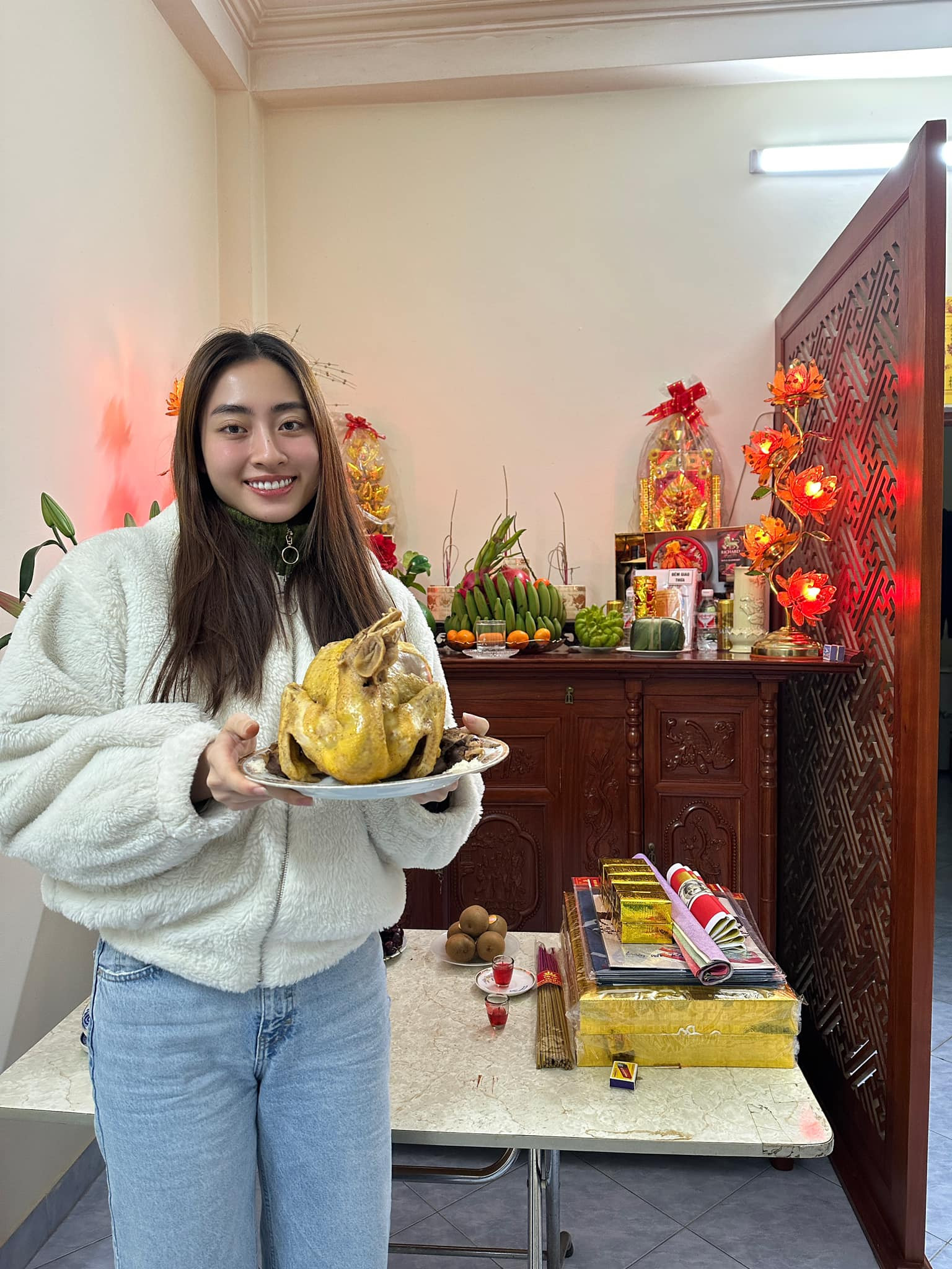 Diễn viên Phương Oanh diện đồ cá tính, lấy lại tinh thần vui vẻ sau ồn ào tình cảm. MC Phí Linh rạng rỡ cùng chồng diện áo dài Tết. Đây là lần đầu ông xã của cô chịu mặc áo dài chụp ảnh.Hoa hậu Đặng Thu Thảo đẹp dịu dàng giữa căn nhà bày trí muôn vàn hoa tươi đón Tết.Diễn viên Quốc Trường bày biện mâm cỗ tất niên.