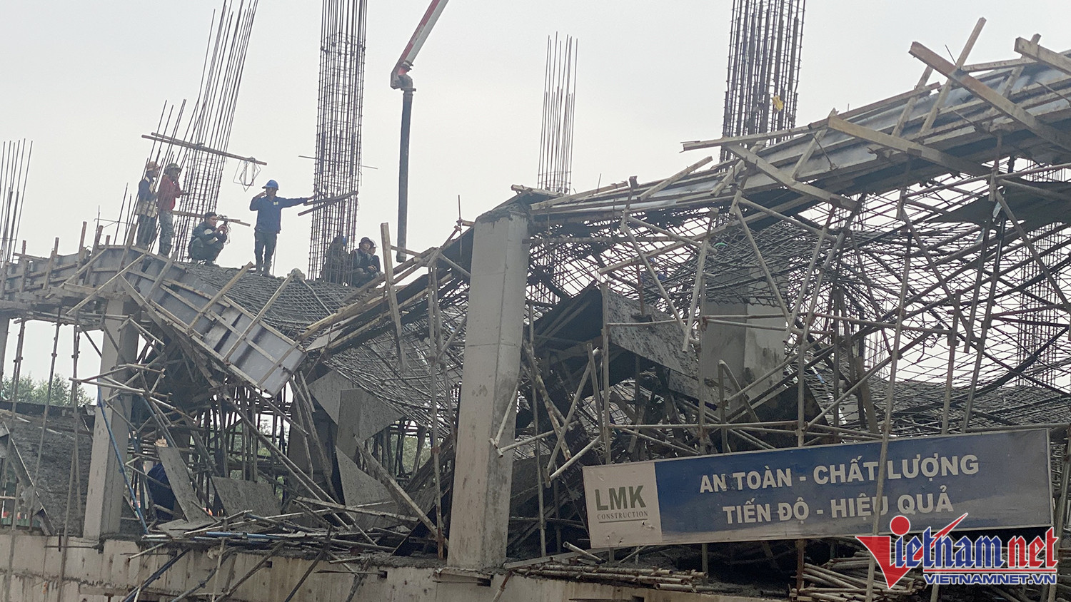 Vào thời điểm trên, khi đơn vị thi công đang bơm bê tông tươi cho mặt sàn tầng 2 của toà nhà thì một số điểm giàn giáo bằng sắt rung lắc, đổ sập.