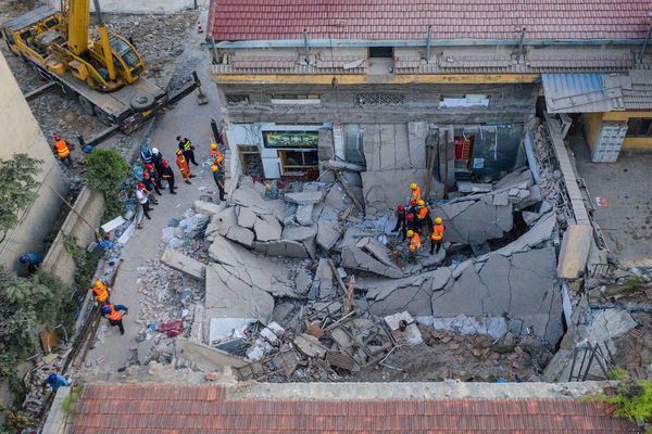 Hàng trăm nhân viên cứu hộ đã nhanh chóng có mặt và tìm kiếm những người bị vùi lấp dưới đống đổ nát. Hình ảnh trên truyền hình Trung Quốc cho thấy, các nhân viên cứu hộ phải nâng nhiều tấm bê tông nặng nề.