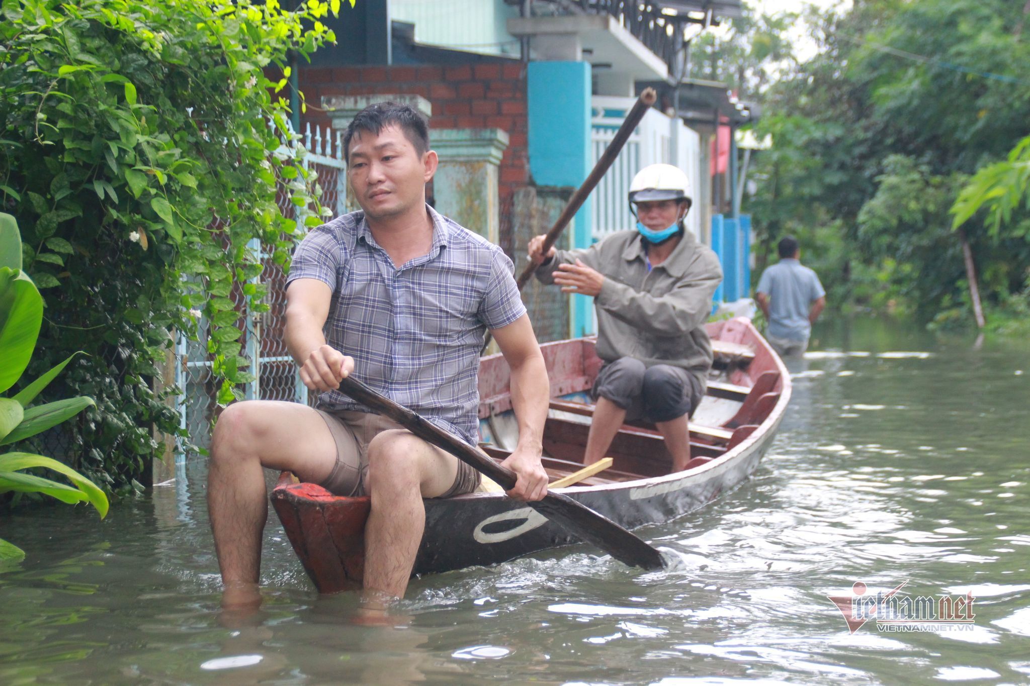 Nước trên sông Tam Kỳ đã dâng lên đường ngập sâu gần nửa mét. Một số khu vực trũng sát bờ sông có nơi ngập đến 1,5m, người dân di chuyển bằng ghe.