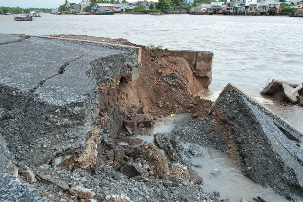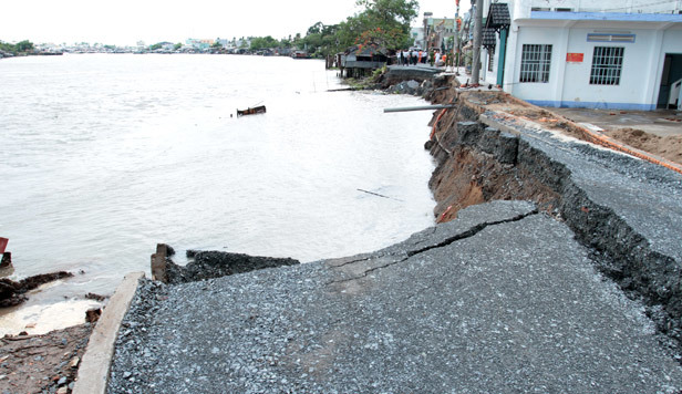![]() Hàng trăm mét đường đang thi công bị trôi xuống sông.
