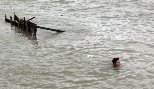 Hai người dân xuống sông vớt tài sản bất chấp nguy hiểm.