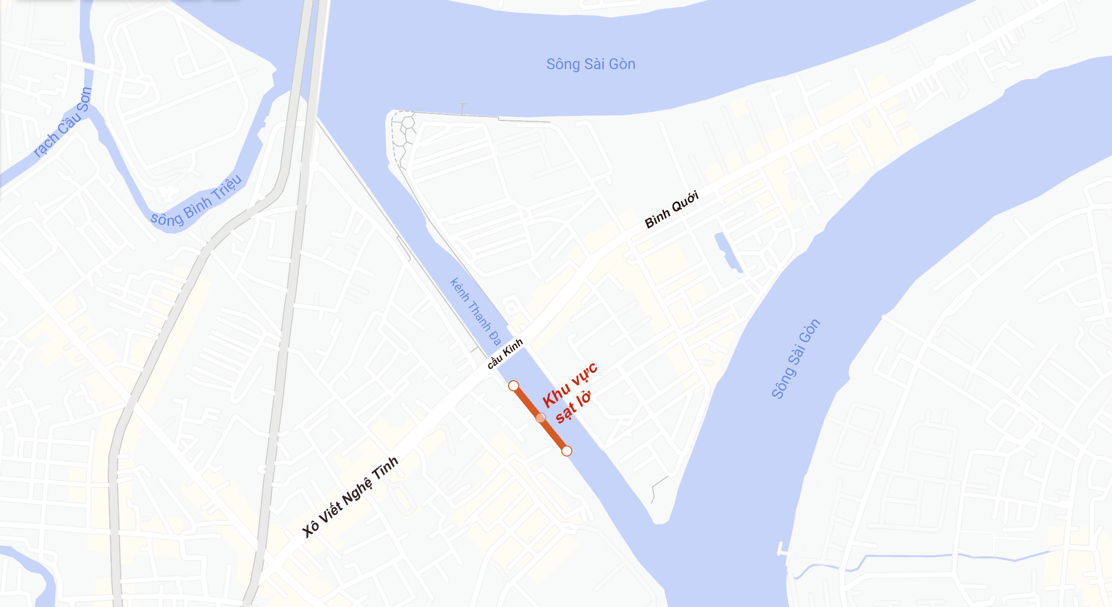 Khu vực sạt lở đang mở rộng phạm vi ảnh hưởng nằm ở bờ phải kênh Thanh Đa, cách hạ lưu cầu Kinh khoảng 50m, thượng lưu 120m.