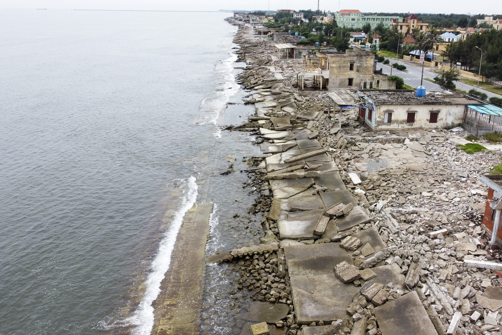 Tuyến kè bờ biển Thịnh Long (huyện Hải Hậu, Nam Định) bị đứt gãy, vỡ nát và xuống cấp trầm trọng kéo theo các công trình phục vụ du lịch cạnh đó cũng sóng đánh sập đổ, hoang tàn.