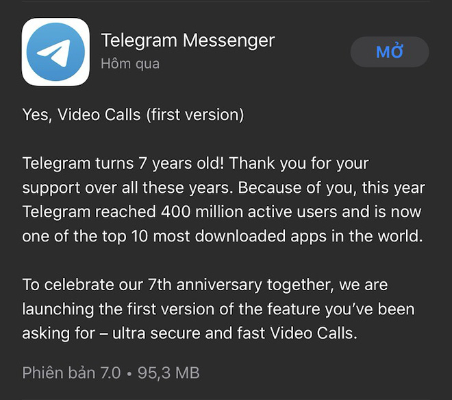 Telegram thông báo với người dùng về bản cập nhật mới nhân dịp kỉ niệm 7 năm tuổi.