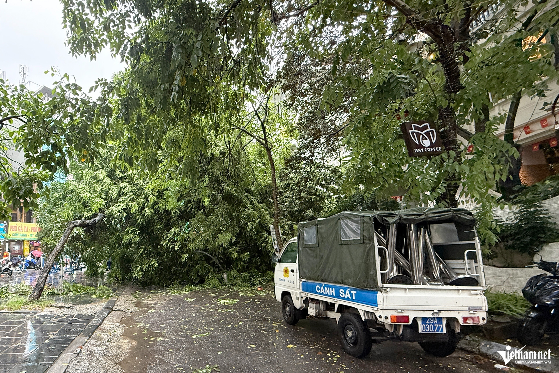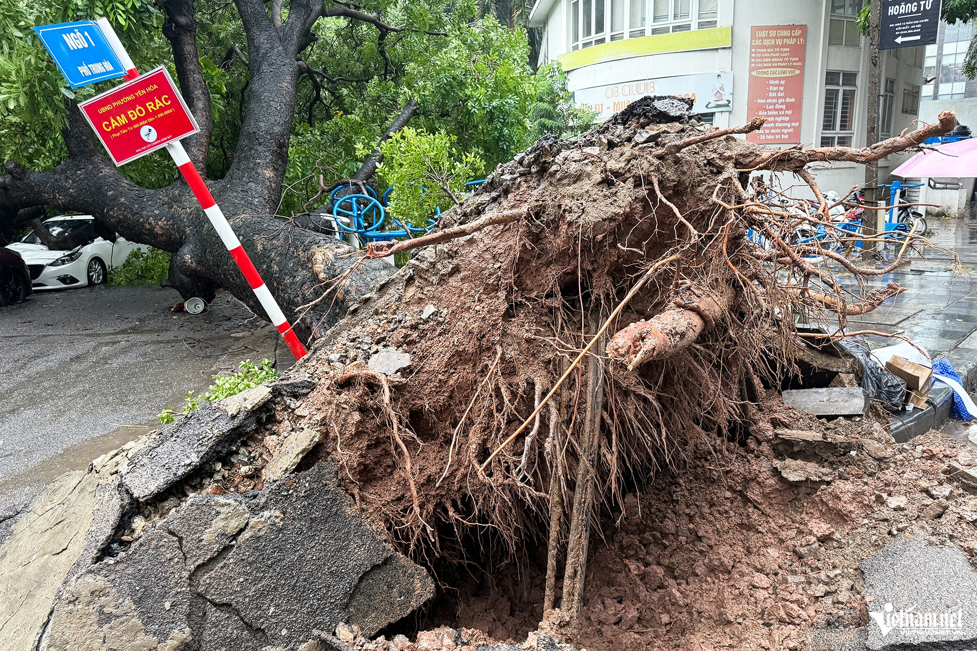 Trước đó, vào sáng 26/8, một cây cổ thụ ở nút Trần Phú - Chu Văn An (phường Ba Đình) cũng bị bật gốc đè trúng 2 ô tô.