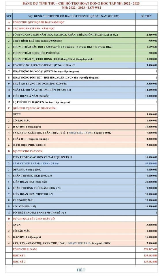 Trước đó VietNamNet đã có phản ánh về tình trạng ban phụ huynh lớp 9/12 Trường THCS Lê Quý Đôn (Quận 3, TP.HCM) đã đưa ra một bảng dự chi năm học 2022-2023 với 32 hạng mục. Tổng số tiền dự chi cho các hạng mục hơn 270 triệu đồng, trong đó mỗi học kỳ I và II dự chi hơn 135 triệu đồng.
